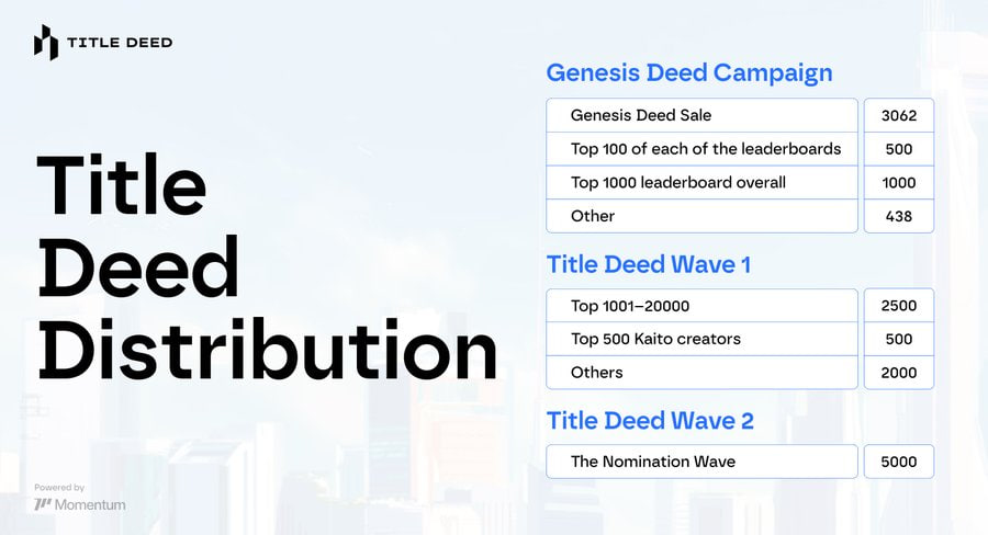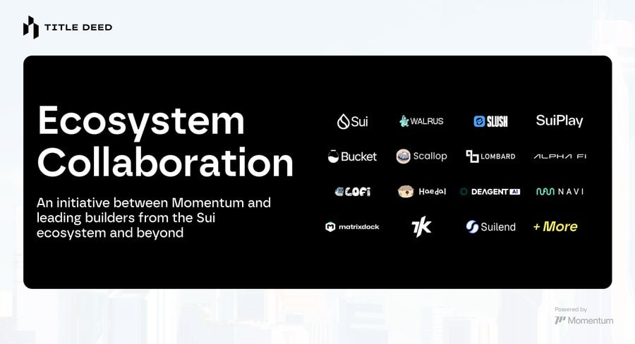 Chiến dịch Title Deed NFT Giveaway được triển khai bởi Momentum Finance, với sự đồng hành của các builder, dự án và ví hàng đầu trong hệ Sui, bao gồm: Sui, Slush Wallet, Walrus, Suiplay, Alphafi, LOFI, MatrixDock, Navi, Suilend, Scallop, 7k, Bucket, Overtake, DeAgent AI cùng nhiều đối tác khác.